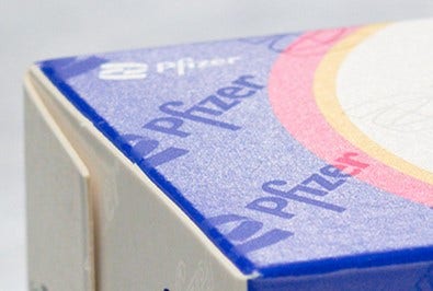 Krabička má bezbarvý, lesklý povrch s opakujícím se vzorem názvu a loga společnosti Pfizer po celé ploše. Název a logo společnosti Pfizer jsou v kontrastním matném provedení.
